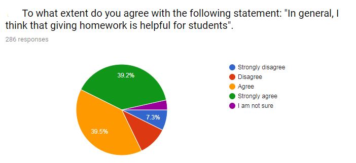 I asked two questions which I hoped might reveal a little something about teachers' working conditions. The first question asked whether they were encouraged to give homework in their schools. 64% said yes, 12% said no (there were other responses which fell outside of these two opposites). Again, I found this interesting as I have only ever once been encouraged to give students homework in 15 years of teaching.